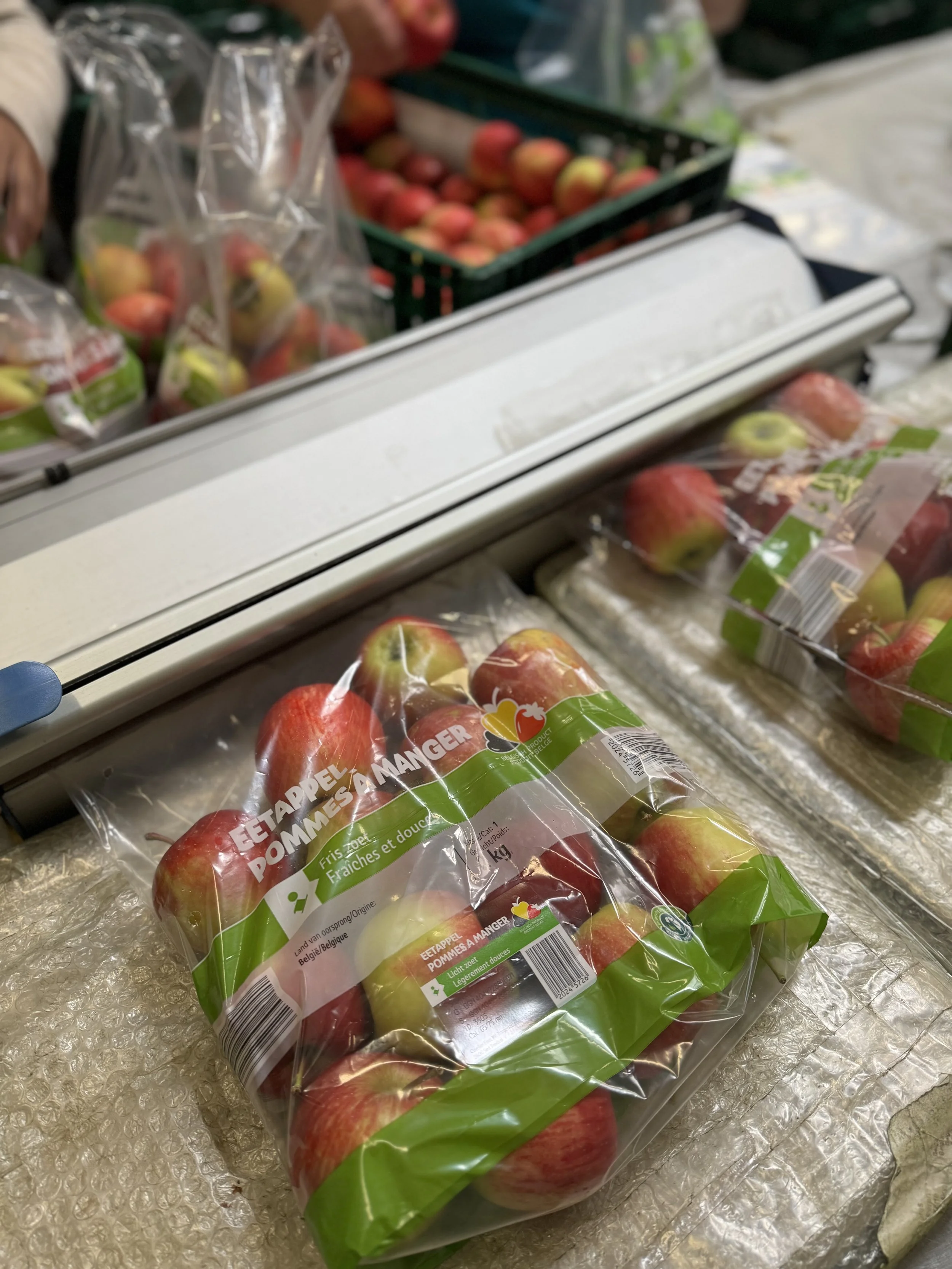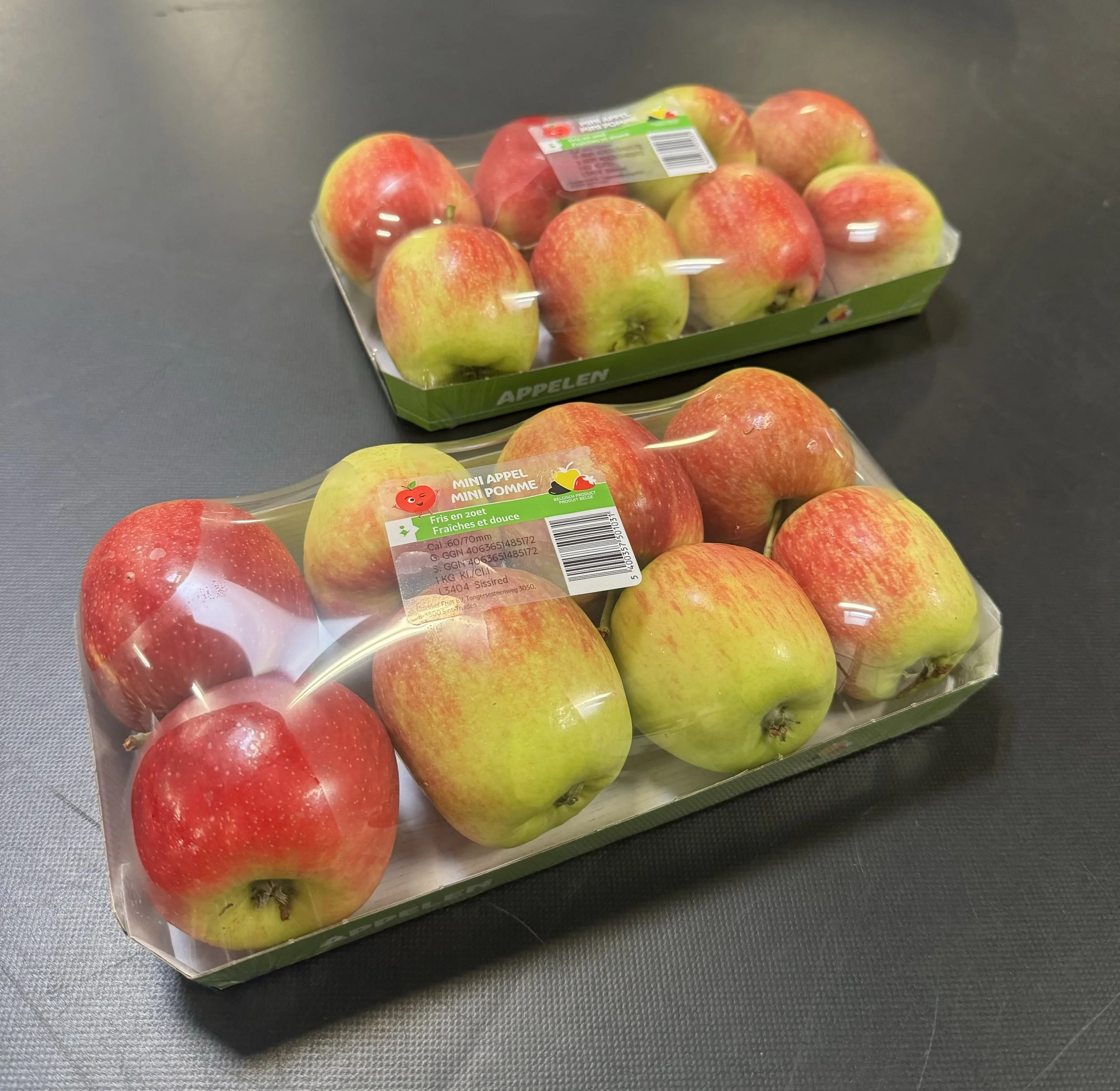 Voor het verpakken van appels beschikken we eveneens over een machine met trayless flowpack. De appels worden dan in een voorbedrukte folie verpakt zonder tray. Traceergegevens kunnen op de folie geprint worden.